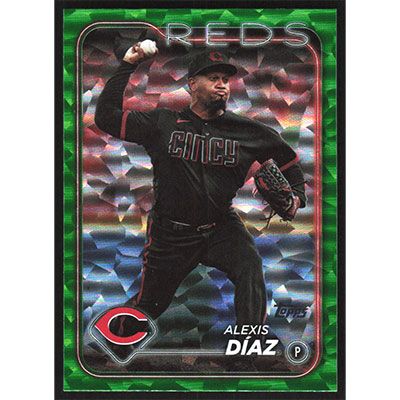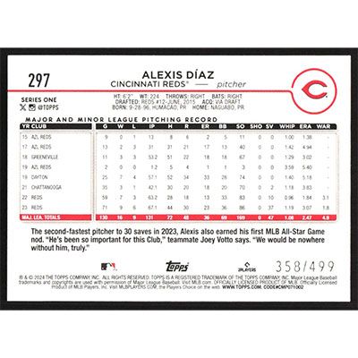 This is a 2024 Topps Green Foil Alexis Diaz baseball card. The card is #297 and pictures show condition. This card is limited; #'d 358/499. Team(s): Cincinnati Reds