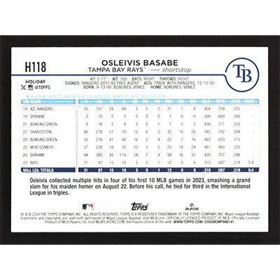 This is a 2024 Topps Holiday Osleivis Basabe baseball card. The card is #H118 and pictures show condition.