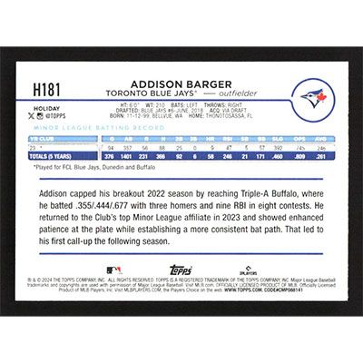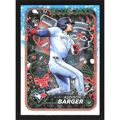 This is a 2024 Topps Holiday Addison Barger baseball card. The card is #H181 and pictures show condition. Team(s): Toronto Blue Jays Rookie Card (RC)