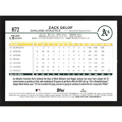 This is a 2024 Topps Holiday Zack Gelof baseball card. The card is #H72 and pictures show condition.