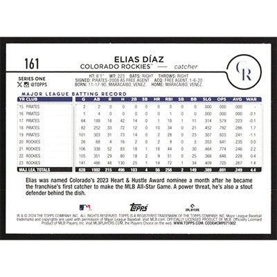 This is a 2024 Topps Rainbow Foil Elias Diaz baseball card. The card is #161 and pictures show condition.