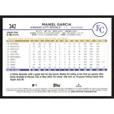 This is a 2024 Topps Rainbow Foil Maikel Garcia baseball card. The card is #342 and pictures show condition.