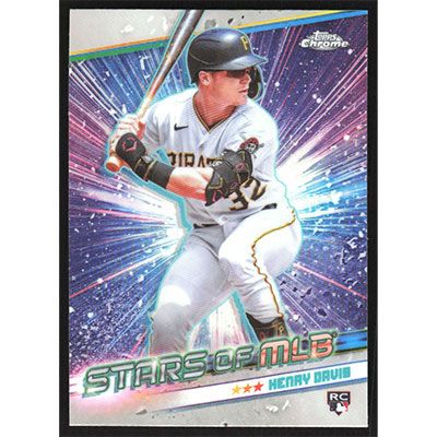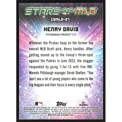 This is a 2024 Topps Stars of MLB Chrome Henry Davis baseball card. The card is #CSMLB-27 and pictures show condition. Team(s): Pittsburgh Pirates Rookie Card (RC)