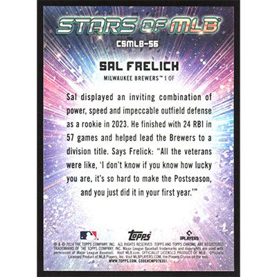 This is a 2024 Topps Stars of MLB Chrome Sal Frelick baseball card. The card is #CSMLB-56 and pictures show condition. Team(s): Milwaukee Brewers Rookie Card (RC)