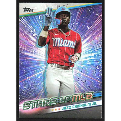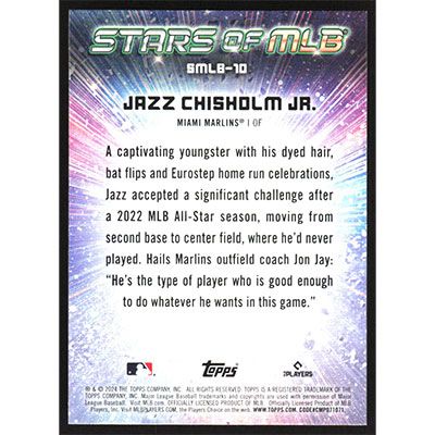 This is a 2024 Topps Stars of MLB Jazz Chisholm Jr. baseball card. The card is #SMLB-10 and pictures show condition.