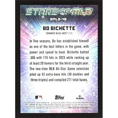 This is a 2024 Topps Stars of MLB Bo Bichette baseball card. The card is #SMLB-46 and pictures show condition.