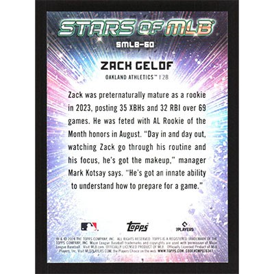 This is a 2024 Topps Stars of MLB Zack Gelof baseball card. The card is #SMLB-60 and pictures show condition. Team(s): Oakland Athletics Rookie Card (RC)