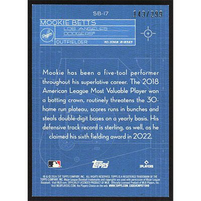 This is a 2024 Topps Superstar Blueprint Black Mookie Betts baseball card. The card is #SB-17 and pictures show condition. This card is limited; #'d 143/299.