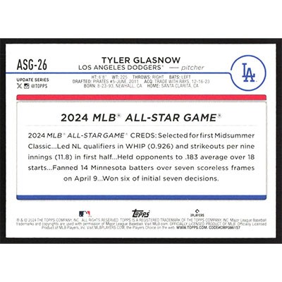 This is a 2024 Topps Update '24 All-Star Game Tyler Glasnow baseball card. The card is #ASG-26 and pictures show condition. Team(s): Los Angeles Dodgers