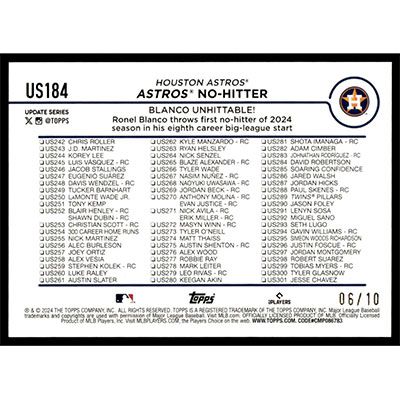 This is a 2024 Topps Update Halloween Black Cat Ronel Blanco Season Highlights Checklist baseball card. The card is #US184 and pictures show condition. This card is limited; #'d 06/10.