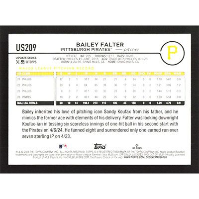 This is a 2024 Topps Update Halloween Jack O'Lantern Bailey Falter baseball card. The card is #US209 and pictures show condition. Team(s): Pittsburgh Pirates