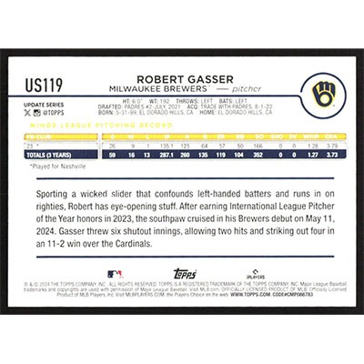This is a 2024 Topps Update Halloween Orange and Black Foil Robert Gasser baseball card. The card is #US119 and pictures show condition. Team(s): Milwaukee Brewers Rookie Card (RC)