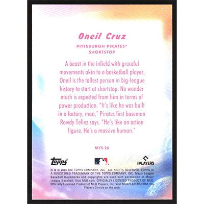 This is a 2024 Topps Update Mystical Oneil Cruz baseball card. The card is #MYS-26 and pictures show condition.