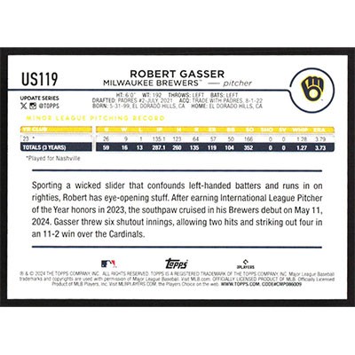 This is a 2024 Topps Update Royal Blue Robert Gasser baseball card. The card is #US119 and pictures show condition. Team(s): Milwaukee Brewers Rookie Card (RC)