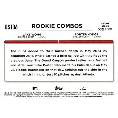 This is a 2024 Topps Update Jake Wong and Porter Hodge Rookie Combos baseball card. The card is #US106 and pictures show condition. Team(s): Chicago Cubs Rookie Card (RC)