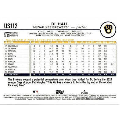 This is a 2024 Topps Update DL Hall baseball card. The card is #US112 and pictures show condition.