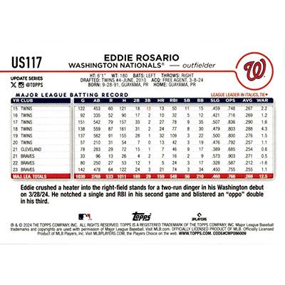 This is a 2024 Topps Update Eddie Rosario baseball card. The card is #US117 and pictures show condition.