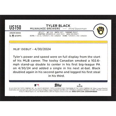 This is a 2024 Topps Update Tyler Black Rookie Debut baseball card. The card is #US150 and pictures show condition. Team(s): Milwaukee Brewers Rookie Card (RC)