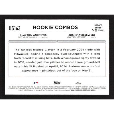This is a 2024 Topps Update Clayton Andrews and Josh Maciejewski Rookie Combos baseball card. The card is #US163 and pictures show condition. Team(s): New York Yankees Rookie Card (RC)
