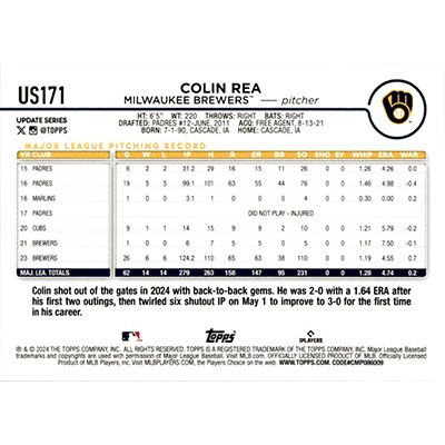 This is a 2024 Topps Update Colin Rea baseball card. The card is #US171 and pictures show condition.