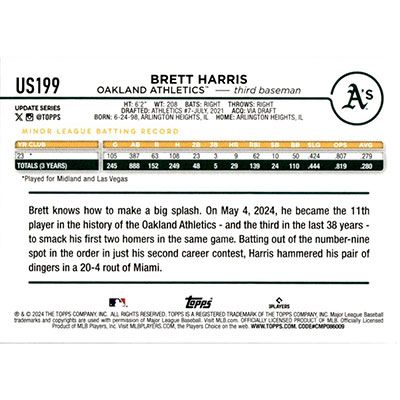 This is a 2024 Topps Update Brett Harris baseball card. The card is #US199 and pictures show condition.
