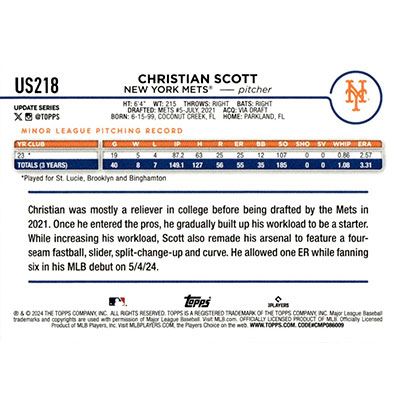 This is a 2024 Topps Update Christian Scott baseball card. The card is #US218 and pictures show condition.