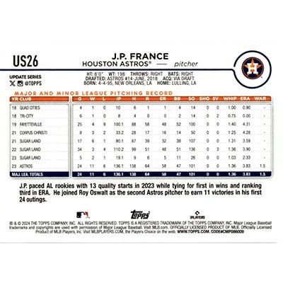 This is a 2024 Topps Update J.P. France baseball card. The card is #US26 and pictures show condition.