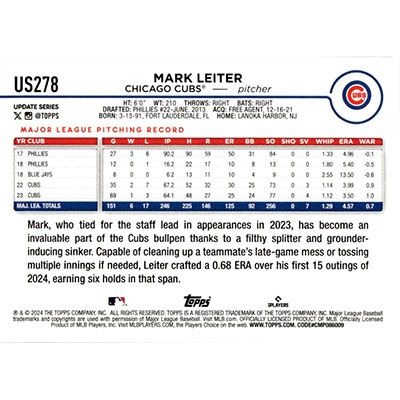 This is a 2024 Topps Update Mark Leiter baseball card. The card is #US278 and pictures show condition.