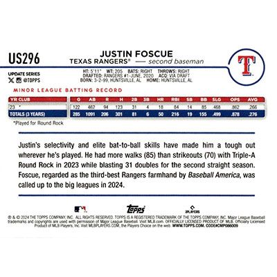 This is a 2024 Topps Update Justin Foscue baseball card. The card is #US296 and pictures show condition.