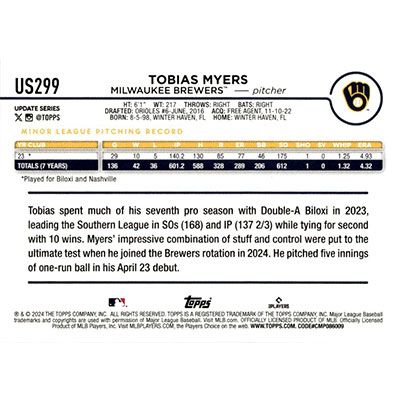 This is a 2024 Topps Update Tobias Myers baseball card. The card is #US299 and pictures show condition.