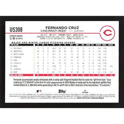 This is a 2024 Topps Update Fernando Cruz baseball card. The card is #US308 and pictures show condition.