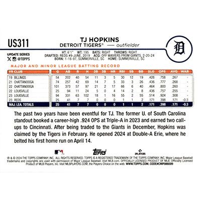 This is a 2024 Topps Update TJ Hopkins baseball card. The card is #US311 and pictures show condition.