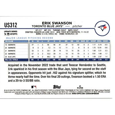 This is a 2024 Topps Update Erik Swanson baseball card. The card is #US312 and pictures show condition.