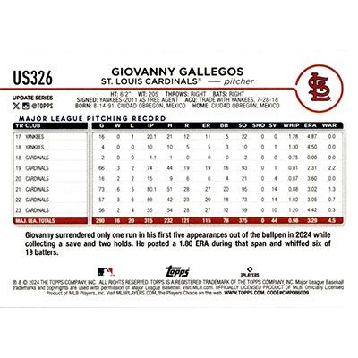 This is a 2024 Topps Update Giovanny Gallegos baseball card. The card is #US326 and pictures show condition.