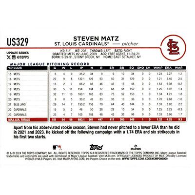 This is a 2024 Topps Update Steven Matz baseball card. The card is #US329 and pictures show condition.