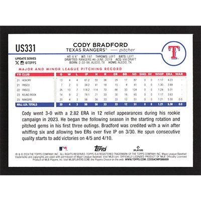 This is a 2024 Topps Update Cody Bradford baseball card. The card is #US331 and pictures show condition.