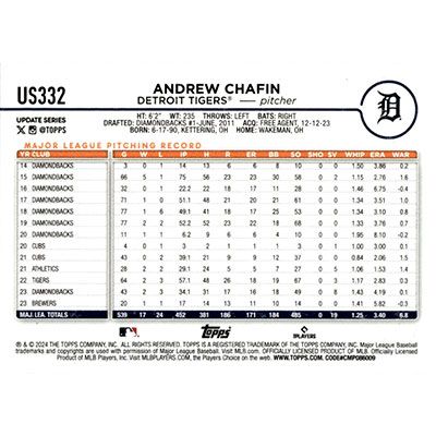 This is a 2024 Topps Update Andrew Chafin baseball card. The card is #US332 and pictures show condition.