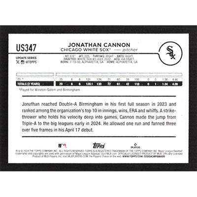 This is a 2024 Topps Update Jonathan Cannon baseball card. The card is #US347 and pictures show condition. Team(s): Chicago White Sox Rookie Card (RC)