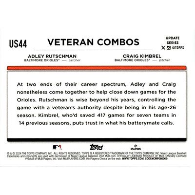 This is a 2024 Topps Update Adley Rutschman and Craig Kimbrel Veteran Combos Battery Power baseball card. The card is #US44 and pictures show condition.