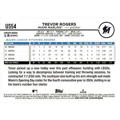 This is a 2024 Topps Update Trevor Rogers baseball card. The card is #US54 and pictures show condition.