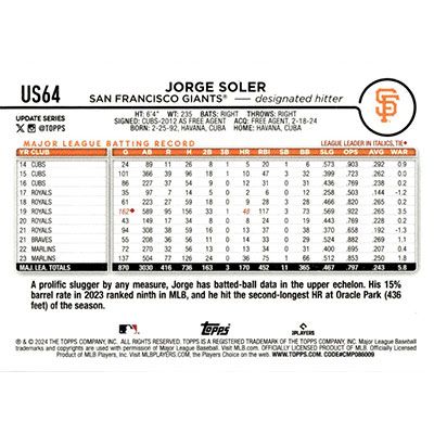 This is a 2024 Topps Update Jorge Soler baseball card. The card is #US64 and pictures show condition.