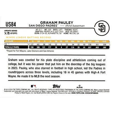 This is a 2024 Topps Update Graham Pauley baseball card. The card is #US84 and pictures show condition.