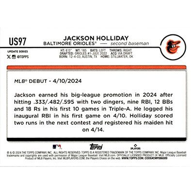This is a 2024 Topps Update Jackson Holliday Rookie Debut baseball card. The card is #US97 and pictures show condition. Team(s): Baltimore Orioles Rookie Card (RC)