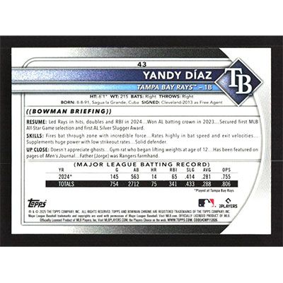 This is a 2025 Bowman Chrome Yandy Diaz baseball card. The card is #43 and pictures show condition.