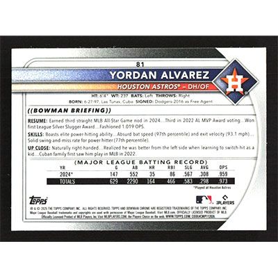 This is a 2025 Bowman Chrome Yordan Alvarez baseball card. The card is #81 and pictures show condition.