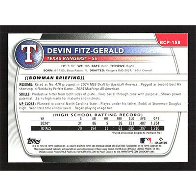 This is a 2025 Bowman Chrome Prospects Devin Fitz-Gerald baseball card. The card is #BCP-158 and pictures show condition.