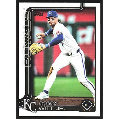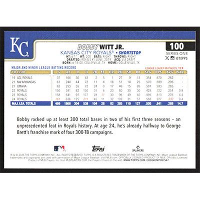 This is a 2025 Topps Bobby Witt Jr. baseball card. The card is #100 and pictures show condition.