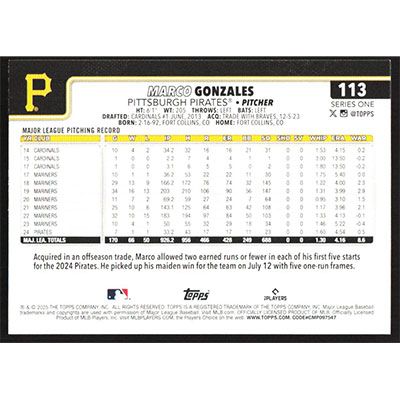 This is a 2025 Topps Marco Gonzales baseball card. The card is #113 and pictures show condition.