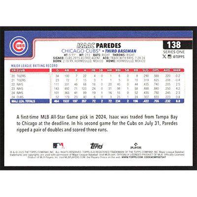 This is a 2025 Topps Isaac Paredes baseball card. The card is #138 and pictures show condition.