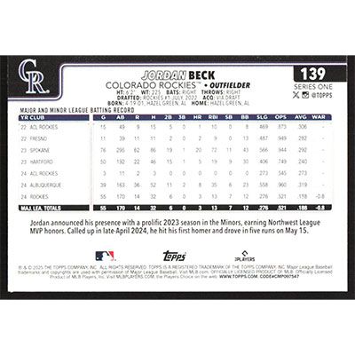 This is a 2025 Topps Jordan Beck baseball card. The card is #139 and pictures show condition.